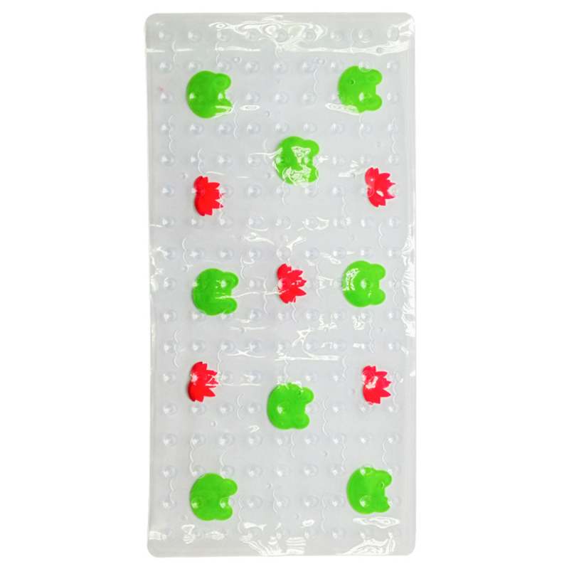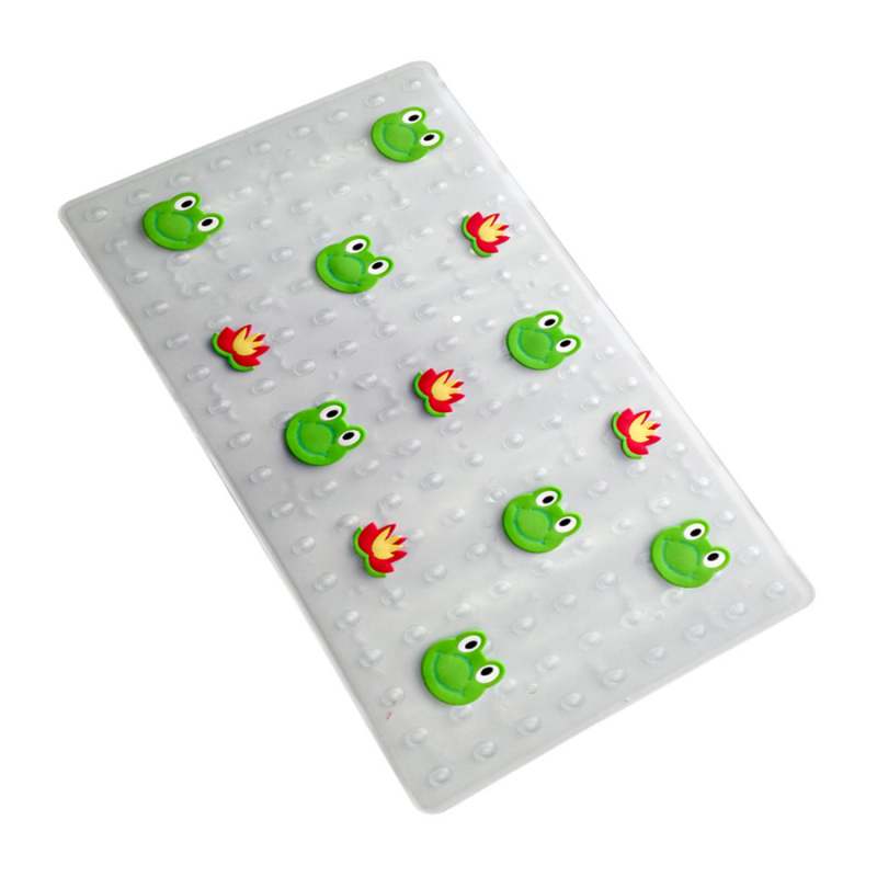 Tapete antideslizante, elaborado en plastico, diseño ranas, contiene cientos de ventosas que lo adieren firmemente al piso, evitando caidas, es resistente a moho, hongos y bacterias, no emana olores. Dimensiones: 36x79cm