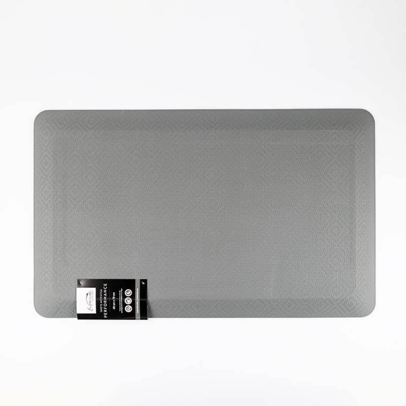 tapete antifatiga Expressions Performan, hecho de 100% poliuretano, con medidas de 75 cm de largo y 45 cm de ancho. Su color gris le da un toque elegante y versátil para cualquier espacio