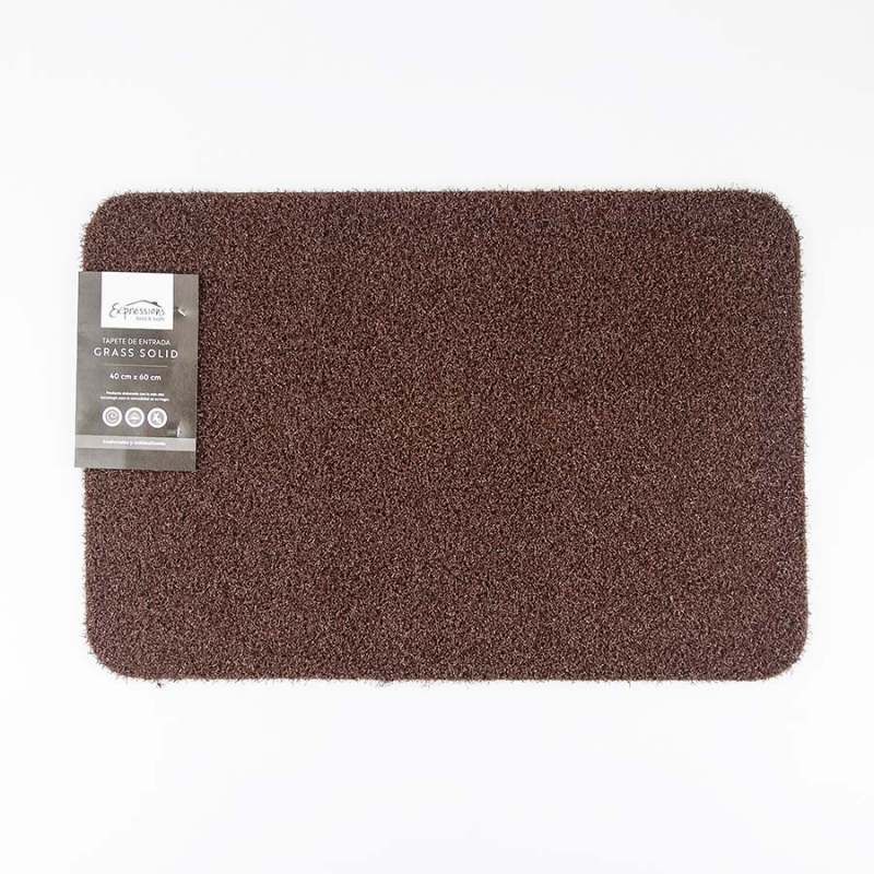 tapete de entrada Expressions Grass Solid, hecho de 100% polipropileno, con medidas de 60 cm de largo y 40 cm de ancho. Su color cafe le da un toque elegante y versátil para cualquier entrada.
