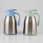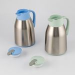 Construido con un cuerpo de acero inoxidable y acabados superiores en polipropileno de colores. Tiene una capacidad de 1000 ml y utiliza un sistema de tapa con palanca pulsadora para la apertura de la boquilla. El diseño incluye un asa lateral plástica coordinada con el color de la tapa y la base. Disponible en colores surtidos sujetos a disponibilidad de inventario.