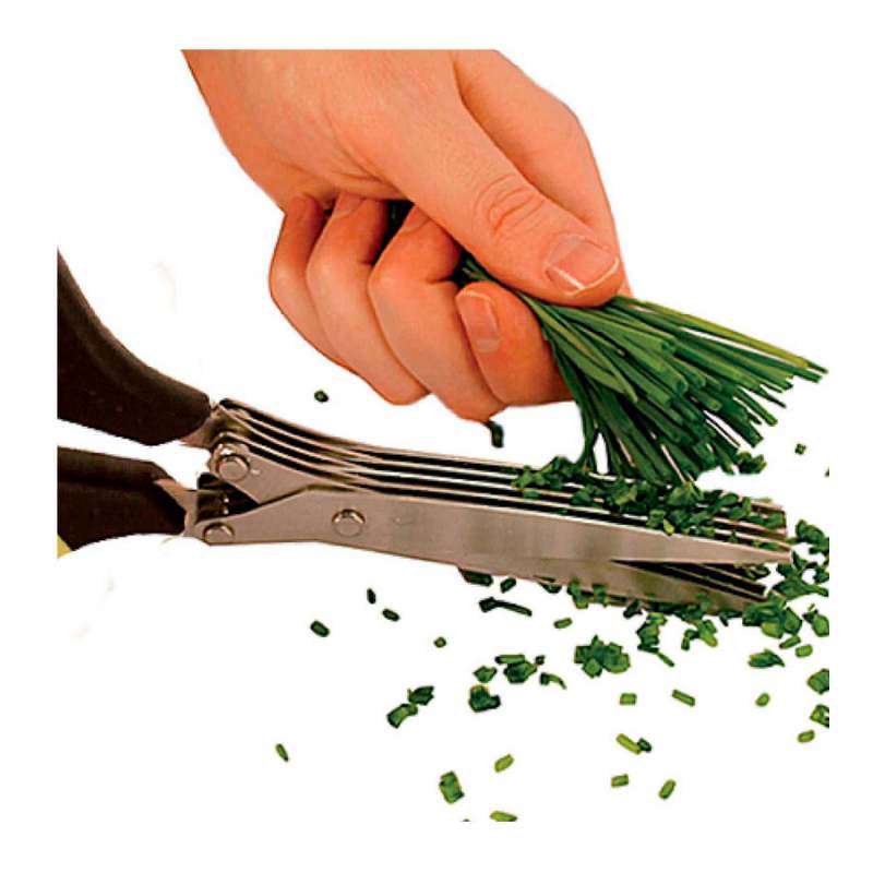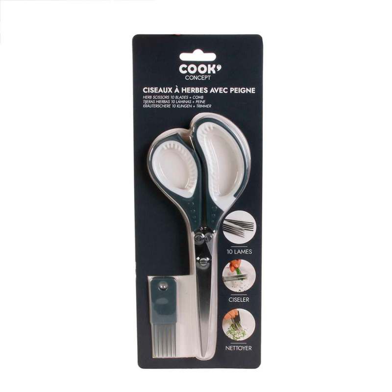Tijeras cook concept para hierbas 5 laminas + peine en acero inoxidable y plastico. Este par de tijeras para hierbas con su peine es esencial en la cocina. compruebe la eficacia de sus 10 cuchillas y ahorre tiempo en todas sus preparaciones. El modelo tiene un mango ergonómico ultra cómodo, su limpieza es fácil y eficaz gracias al peine previsto a tal efecto acero color blanco gris 1.9x20x8 cm 50 % metal.