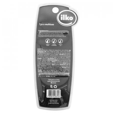 Tijera Multiusos Ilko 199656-Plateado con Rojo Puedes trozar desde pollo hasta abrir nueces, tiene un cuerpo desmontable que lo convierte en dos prácticos y filudos cuchillos. Uno de ellos es tipo sierra y el otro es liso, que incorpora un pelador de verduras. Tijera Multiuso de cocina, cuerpo de Acero Inoxidable 2CR13 HRC 52 y asas de Polipropileno (PP) + TPE, entre las múltiples funciones incluye la Trozadora de huesos de Pollo, destapador de botellas y abridor de tapa rosca. Elevada resistencia a la corrosion.