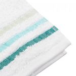 Toalla para manos, 380gr, elaborada 100%algodón, color blanco y turquesa, con dos lineas en la parte inferior, su material la hace absorvente suave al tacto y practica. Dimensiones: 40x65cm