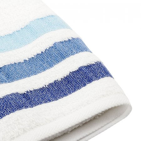 Toalla para cuerpo, 380gr, color blanco, suave al tacto, practica y absorbente, posee un elegante diseño con tres lineas inferiores en diferentes tonalidades de azul. Dimensiones: 70x140cm