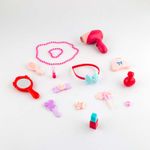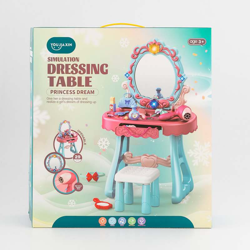 Tocador de belleza de moda, juego de simulación, incluye 1 sticker,2 brazaletes, 2 botellas, 1 cinta, 4 ganchos de cabello, 1 labial, 1 secador de cabello, 1 cojìn, 6 patas, 1 manigueta, 1 bandeja, 1 peine, 1 bolso, 2 espejos, 2 cierres de manigueta, 1 anillo, 1 almohada para silla, fabricado en plastico de alta calidad, no tóxico, proporciona educación mientras las infantes juegan y se divierten, promueve la coordinación manos - ojos, habilidades motoras finas, dimensiones del producto 26.3x15.2x30cm. Edad recomendada de uso mayor de 3 años.