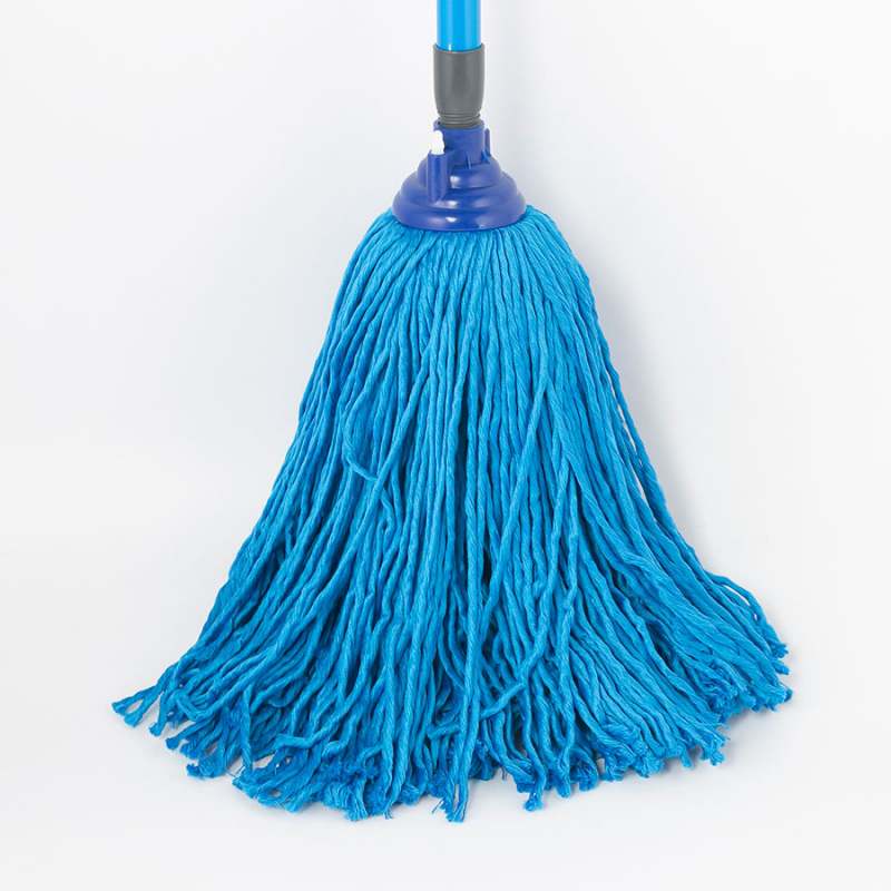 Un trapero de microfibra azul de 250 gramos con un cabo laminado de 140 cm. Excelente para mantener tus pisos limpios y brillantes.