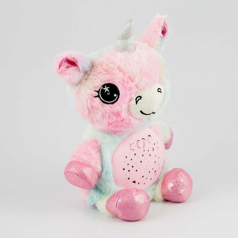 Unicornio proyector de luz nocturna para bebés, reconfortante ayuda para tu hijo al dormir con música de cuna, perfecto para un entretenimiento de sueño fácil para niños pequeños recien nacidos o de edad preescolar, fácil de operar y limpiar, súper suave, hecho de material lavable a mano, requiere 3 pilas AA no incluìdas, dimensiones del producto 25x13x36cm. Edad recomendada de uso mayor de 3 años.