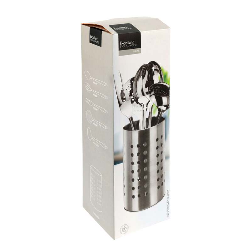Utensilios de cocina en Acero Inoxidable, Color Plateado. X 6 Pzs. Incluye: Un soporte (18 cm.), una cuchara, una espumadera de 33 cm, una espumadera de 32 cm, un cucharón y un tenedor de trinchar. Con un acabado mate que aporta resistencia y un diseño elegante. Tendrás todos los utensilios necesarios para preparar una comida deliciosa.