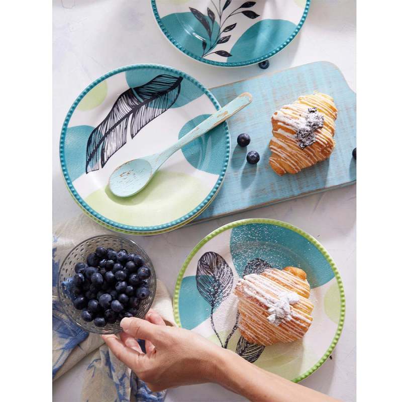 Inspirada en la diosa de la naturaleza, ARTEMISA, que es sinónimo de vida y fortaleza. Las plantas purifican y rivalizan nuestros espacios, incrementado nuestro bienestar y nos brindan un equilibrio emocional en el ambiente.Donde hay plantas, hay vida.  Incluye1 Plato Postre 20.4cm Artemisa Acacia1 Plato Postre 20.4cm Artemisa Alamo1 Plato Postre 20.4cm Artemisa Banana1 Plato Postre 20.4cm Artemisa Rowan4 Plato Pando 27.6cm Artemisa4 Plato Hondo 540.6ml Artemisa4 Mug 321.8ml Esmalte Color Turquesa