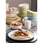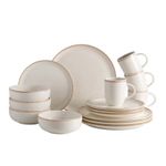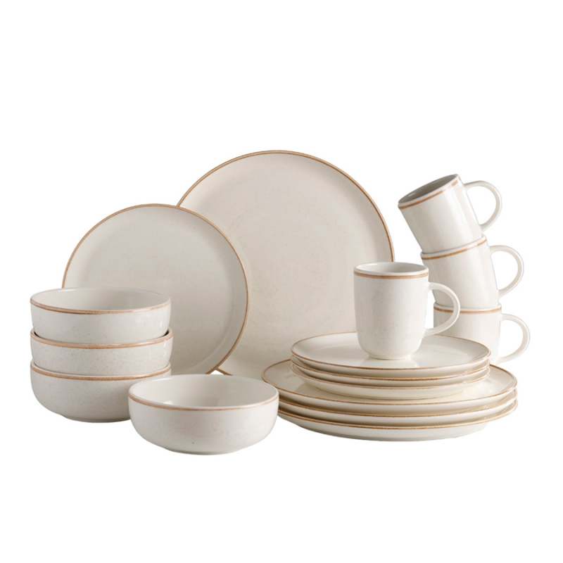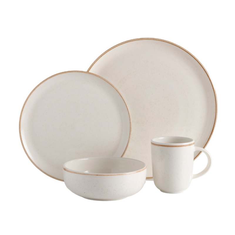 Diseño limpio y luminoso, con formas redondas y tonos claros como protagonistas, esta línea hace gala de una mezcla perfecta entre rusticidad y modernidad. El borde cobrizo da un tono de lujo. Esta vajilla es pintada a mano lo cual le da un toque artesanal único. Apto para microondas y lavavajilla. Aprobado para el uso en contacto con alimentos. Cumple con la norma de plomo y cadmio. Se garantiza que el esmalte no va a generar agrietamiento por cualquier cantidad de lavado con detergentes. Resistencia de la decoración a los detergentes. Incluye: 4 Mug 379.7ml Caoba Beige4 Plato Postre 22cm Caoba Beige4 Plato Pando28.2cm Caoba Beige4 Cerealero 623ml Caoba Beige