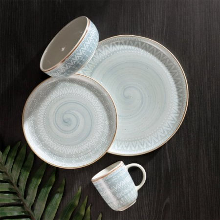 Esta vajilla está inspirada en las grafías africanas y fusiona el arte manual con texturas étnicas. Vajilla pintada a mano manteniendo siempre el encanto de lo artesanal. Las texturas, formas étnicas y colores sutiles te llevarán de regreso al origen, aquel lugar donde todo inició. Apto para microondas y lavavajilla. Aprobado para el uso en contacto con alimentos. Cumple con la norma de plomo y cadmio. Se garantiza que el esmalte no va a generar agrietamiento por cualquier cantidad de lavado con detergentes. Resistencia de la decoración a los detergentes. Incluye: 4 Mug 379.7ml Congo 4 Plato Postre 22cm Congo 4 Plato Pando28.2cm Congo 4 Cerealero 623ml Congo