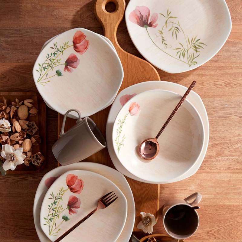 La vajilla Malli evoca el romanticismo vintage de los jardines con su decoración de flores en acuarelas. La combinación de piezas redondas y cuadradas crea un juego perfecto de simetría en tu mesa. ¡Añade un toque de belleza a tus comidas con Malli! Apto para microondas y lavavajilla.Aprobado para el uso en contacto con alimentos.Cumple con la norma de plomo y cadmio.Se garantiza que el esmalte no va a generar agrietamiento por cualquier cantidad de lavado con detergentes.Resistencia de la decoración a los detergentes. 4 Plato Postre 19.5cm Malli4 Plato Pando 24.7cm Malli4 Plato Hondo 730ml Malli4 Mug 306.2ml Color Taupé
