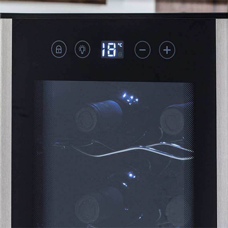 Una vinera elegante en negro, con capacidad de 33 litros y dimensiones pensadas para integrar en espacios reducidos. Dispone de panel táctil de control de temperatura, iluminación interior, estantes cromados extraíbles y sistema de enfriamiento termoeléctrico silencioso, sin compresor