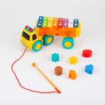 Xilofono diseño camión de instrumentos musicales para empujar y tirar, perfecto para estimular a tu pequeño durante el tiempo de juego con sus atractivos colores y clasificador de formas, fomentará el aprendizaje temprano, dàndole una ventaja al desarrollo cognitivo de tu bebé, hecho de plástico suave, no tóxico, incluye 2 hojas de mùsica, 6 bloques, 1 palillo, dimensiones del producto 27.8x10.3x13.5cm. Edad recomendada de uso mayor de 3 años.
