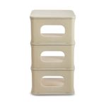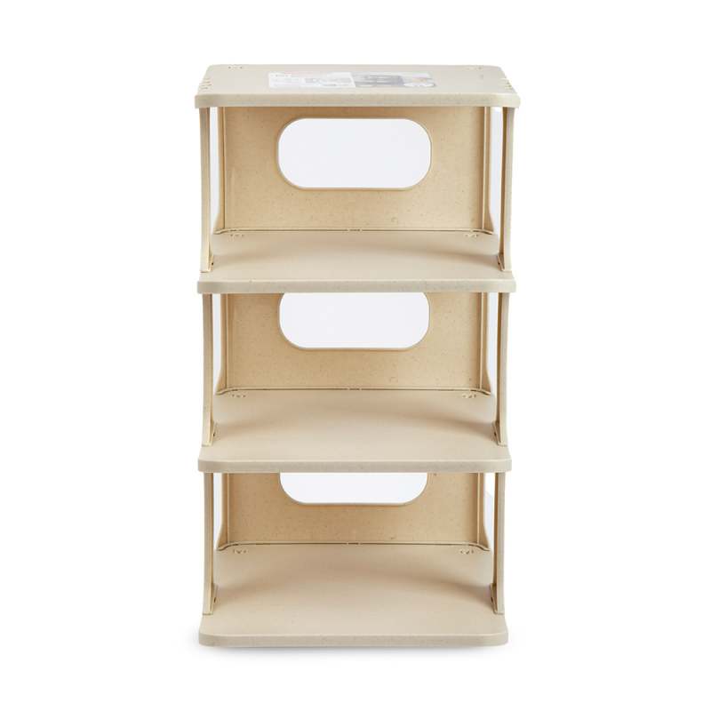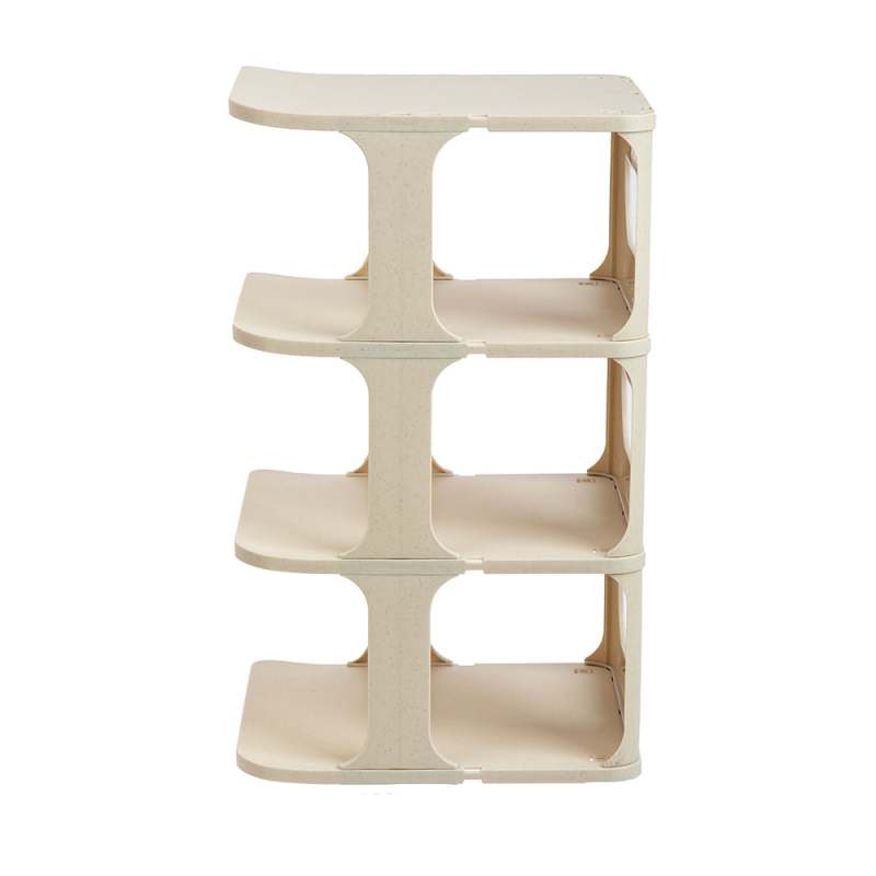 Zapatero beige compacto de cuatro niveles, ideal para espacios reducidos.