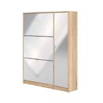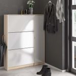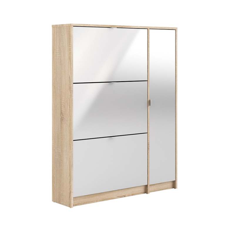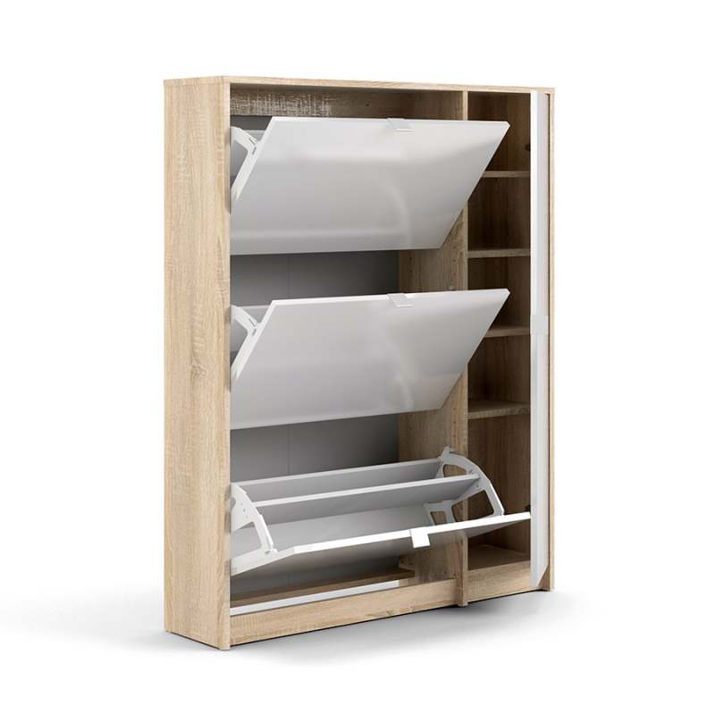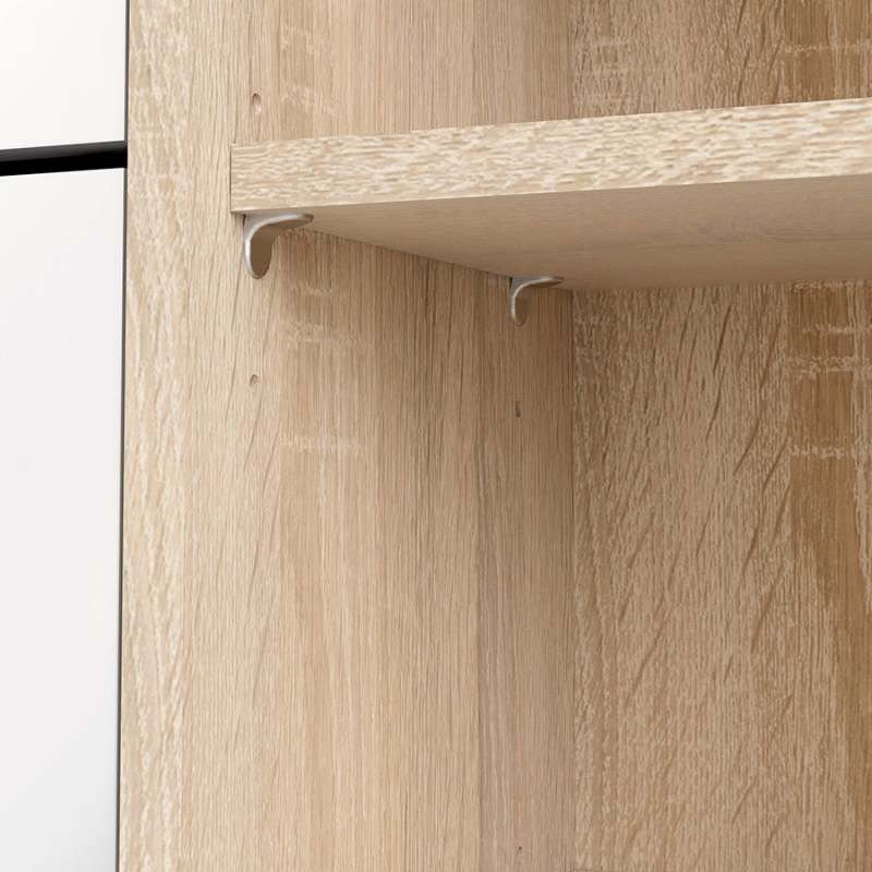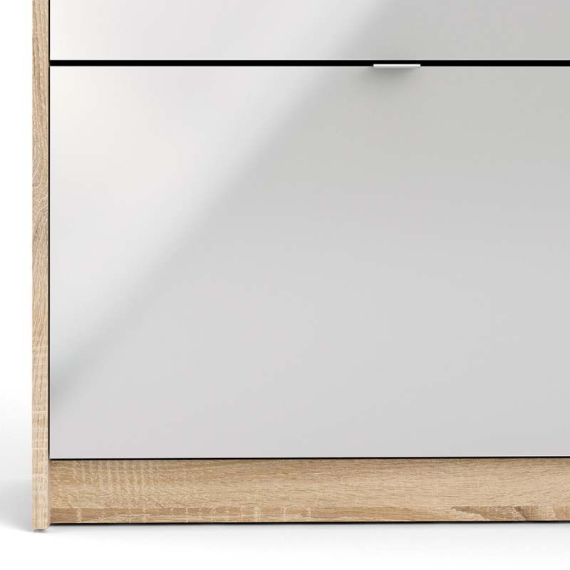 La zapatera Pepe de color roble con blanco alto brillo de la marca Tvilum, está diseñada y fabricada en Dinamarca con altos estándares de calidad en aglomerado y melamina laqueada, esta cuenta con 98.8 cm de ancho, 24.05 cm de profundidad y 123.6 cm de alto. Además cuenta con la certificación internacional FSC, la cual valora el esfuerzo de la marca por la sostenibilidad de los bosques. Este producto se debe limpiar con un paño levemente húmedo. Luego pasar suavemente paño limpio y seco. No utilizar productos abrasivos o lustra muebles. Incluye herrajes de armado y manual de procedimiento para armar (no incluye herramientas eléctricas, destornilladores manuales y martillo).