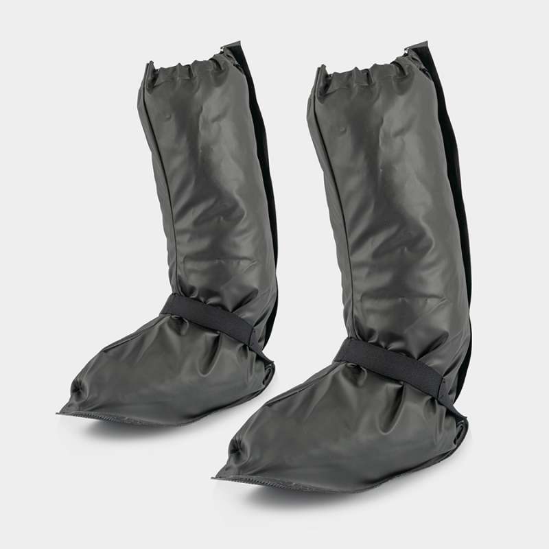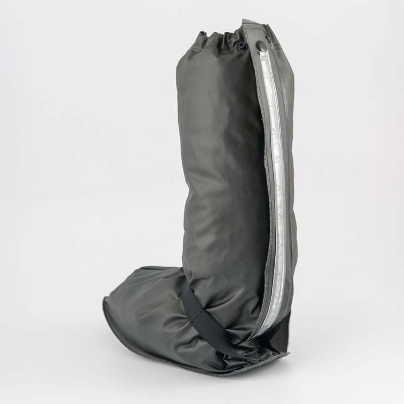 Zapatones impermeables sellados por alta frecuencia. Caña alta, con cremallera que permite apertura total del zapatón para introducir el pie con facilidad. Reflectivo en la parte posterior y caucho con hebilla de ajuste sobre el empeine para que no se deslicen. Suela antideslizante. Pvc con soporte poliester calibre 18. Reforzados en el empeine del pie para los cambios, para mayor durabilidad. Color negro. Para uso a la intemperie. Es ideal para movilidad en moto, bici, eléctrica.